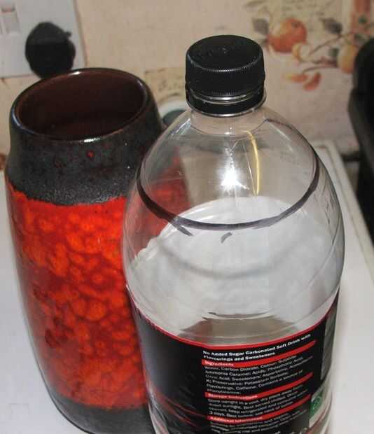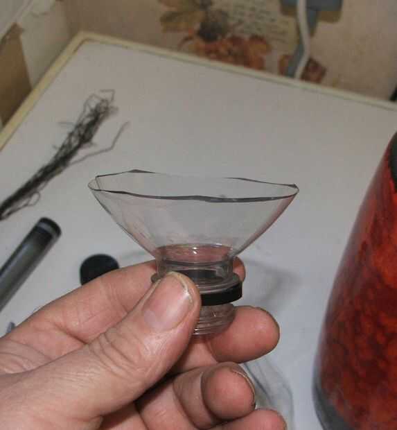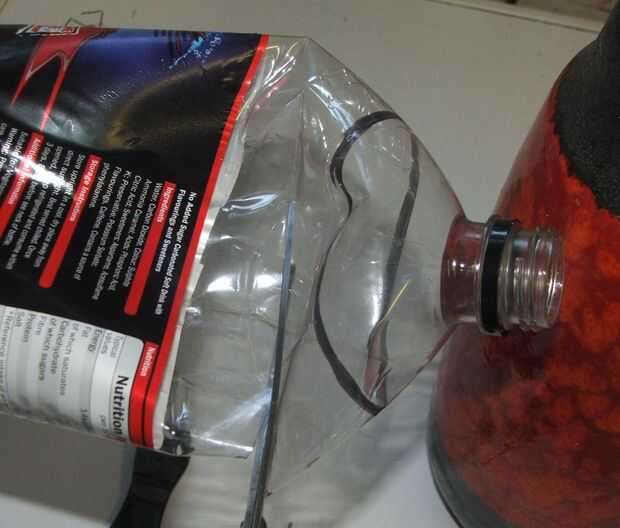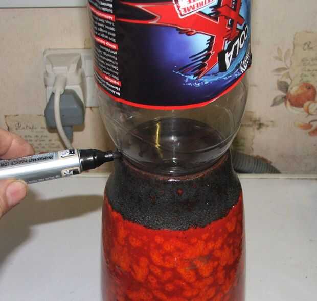Primero invierta la botella de plástico en el vaso y trace una línea alrededor de donde toca el cuello.