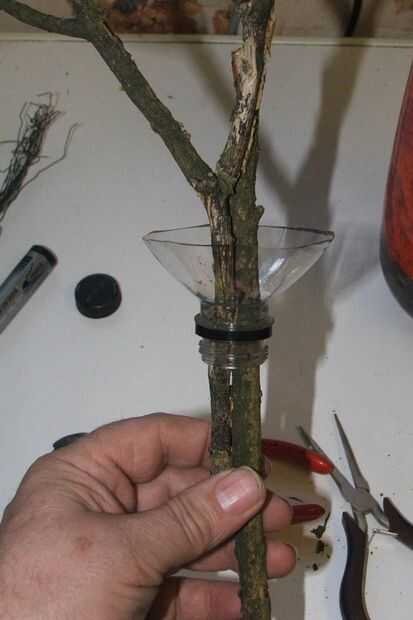 Pasar las ramitas a través del cuello de la botella y sujetarlas con alambre de floristería.