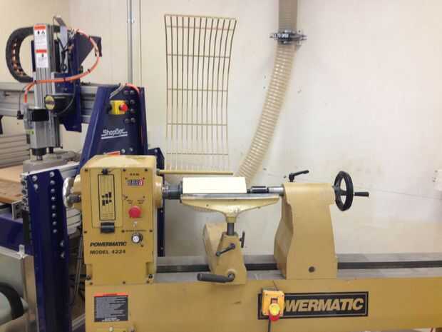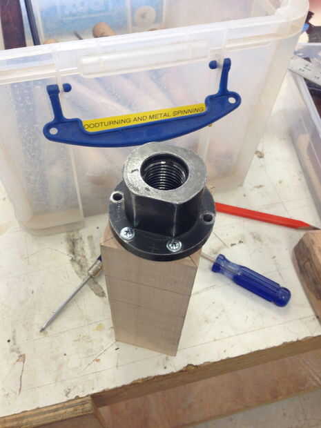 Nota 2 **: Si eres más aventurero, puede utilizar la técnica de montaje directo para montar la pieza directamente en el husillo. Marque el centro de la pieza con un sacador de centro automático. Taladre un orificio de 1-1/4" de diámetro 3/16" profundidad. Con el 1-1/4" taladro de centro, taladro otro 1-1/8" diámetro 1-1/2" profundidad. Pulse el orificio usando una llave de 1 1/4"-8TPI. Ahora usted puede atornillar directamente la pieza en el eje del torno. Esto funciona con el torno de Powermatic que utilizamos en TechShop. Consulte con su propio torno qué dimensión es el tornillo del husillo.