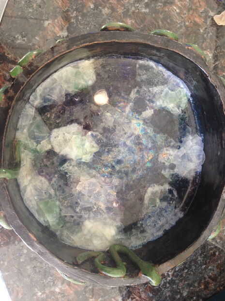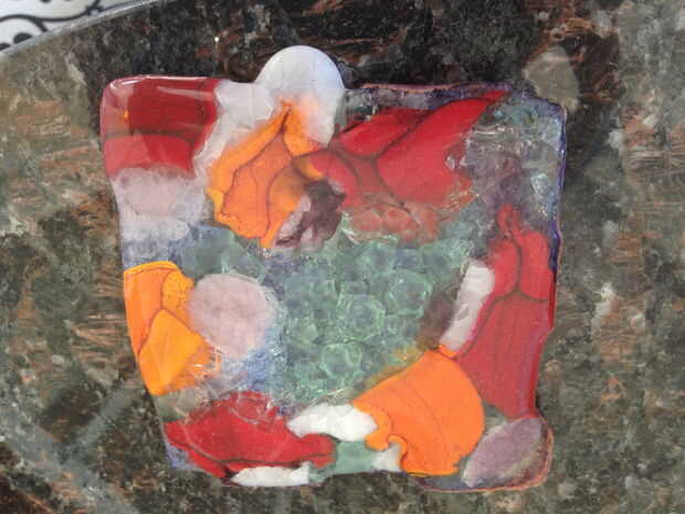La foto de la pieza circular es de esmalte azul con cristal de mar. La pieza rectangular tiene un fondo verde esmaltado con una mezcla de cristales de mar y mosaico de vidrio. La Plaza de cristal tiene una base con un labio de 1/8 de pulgada para evitar que el vidrio sea de mosaico se derrame fuera de la pieza durante la cocción de la arcilla.