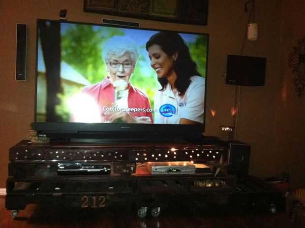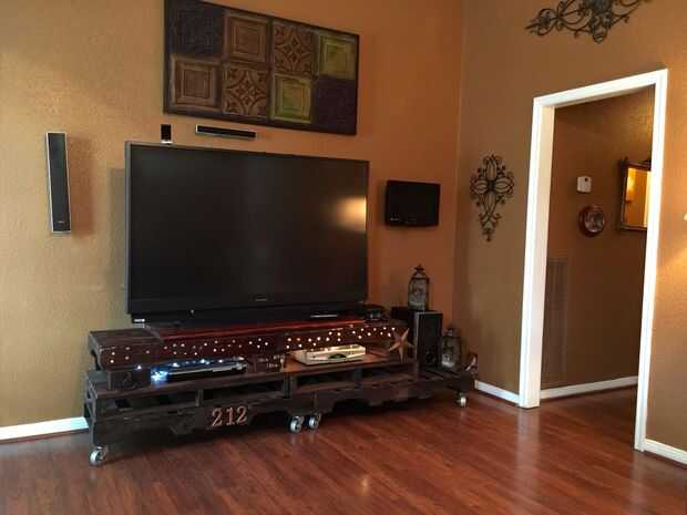 Yo quería tener una pieza de entretenimiento que todos los componentes que tenía y dar espacio de almacenamiento para películas, juegos, etc.... También tuvo que ser fácil de mover para limpiar detrás y enchufe/desenchufe componentes o cambiarlos. Me encantan las plataformas y creé mi diseño usando las paletas que había recibido libros de texto en las semanas antes. Cuando yo era un asistente de la Directora recibí cajas y cajas de nuevos libros de texto en las plataformas. Pregunté si podía mantenerlos y los chicos de mantenimiento estaban felices de no tener que volver a recogerlos. Dijeron que tiraron a la basura... No más!