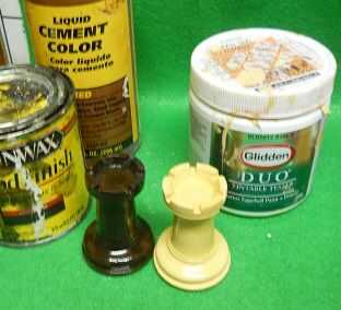 El conjunto blanco se pinta simplemente con Glidden palomino oro color.  Deje que seque durante la noche luego pintar con una capa transparente de poliuretano.  Todas las piezas de ajedrez tendrá 2 capas del poliuretano.  Los hombres de ajedrez oscuro están pintados con 2 manchas para lograr un look casi madera de 2 tonos realmente impresionante!  Primero los pinté con quikrete rojo concreto mancha (disponible en la sección de hormigón de ferretería).  Después de la roja se seca... no es "Rojo" se parece más a terra-cotta.  Este color rojizo oscuro se cubrirá con una capa de tinta para madera MINWAX color negro ébano.  La mancha negra ébano del dolor pero no cubrir completamente la pieza de ajedrez.  Dejar un poco de rojizo mostrando aquí y allá al azar.  Esto le da a la pieza de ajedrez perfectamente con una mirada de madera de 2 tonos que sólo sobre el juego de ajedrez real.