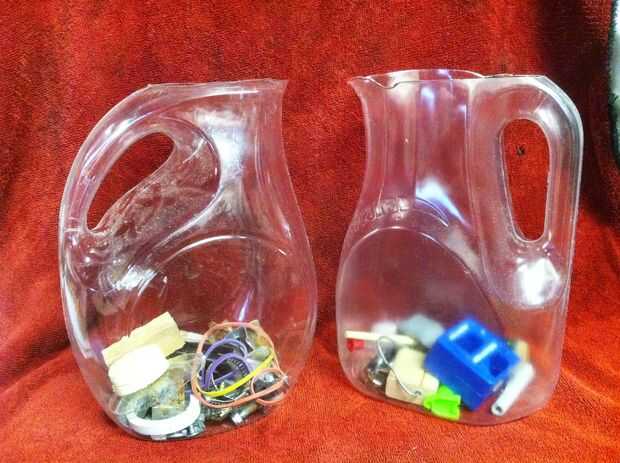 hacer piezas muy funcionales almacenamiento de plástico ya en la papelera de reciclaje. Las botellas de plástico de jugo de naranja gran trabajo. También contenedores de verter de gatos (jarras) funcionan bien. Contenedores con un lado de la manija trabajo mejor. Uso de plástico claro es grande porque se puede ver mucho de lo que está en el recipiente sin tener que cavar ni vierta hacia fuera.