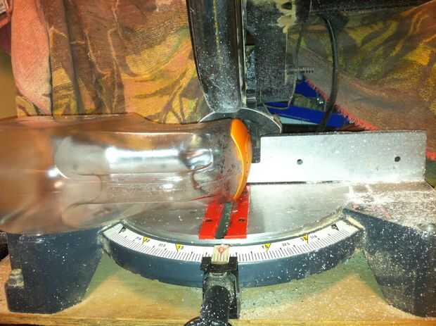 Después de quitar la etiqueta, con cuidado corte la parte superior. Se puede utilizar un cuchillo para uso general (tenga cuidado de verdad) - hablo por experiencia en esto. Mejor aún podría utilizar uno de esos cortadores de cuchillo caliente. No tengo uno de esos pero parece que funciona realmente muy bien. Puede usar una sierra. Usé mi sierra de inglete compuesto. Cuando corte tomar tiempo para estudiar el diseño de la botella. Quieres tener todavía una botella estructuralmente después del corte. Equilibrar tu deseo de gran apertura con la necesidad de dejar material en la parte superior del mango. En la foto, puedes ver mi botella luce como antes y después del corte.