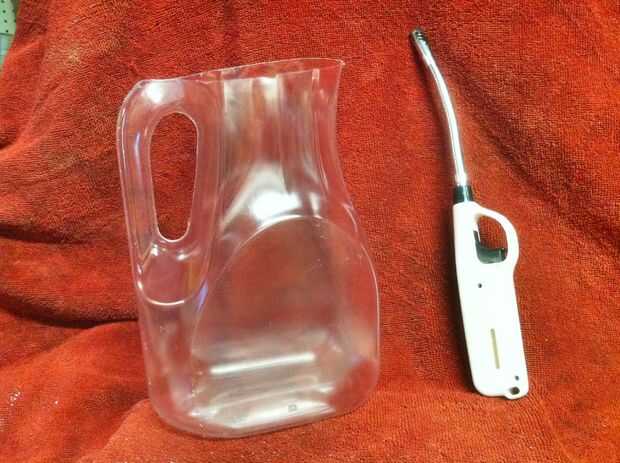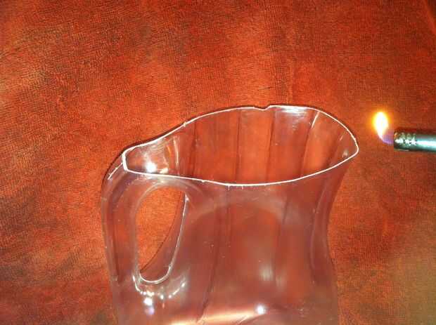El último paso es refinar el labio. El papel de lija hizo un buen trabajo, pero puede ser mejor con fuego o calor. Utilizo un butano barato encendedor para derretir sólo el borde del labio de la botella. Recorrer todo el camino. Mientras que el plástico es cálido, puede remodelar el borde a tu gusto. Ahora su ventaja se transclucent y suave y menos "rayado". También lave y seque el recipiente y usted es buenos ir.