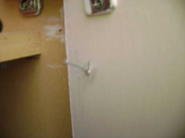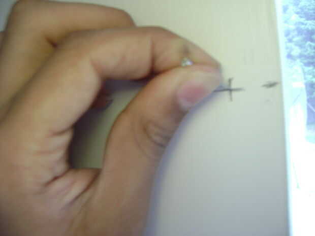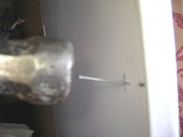 Cuidadosamente, Martille un clavo en el centro de cada cruz. No martíllelo en recta, pero con un ligero ángulo para punto encima de la punta plana del clavo y el extremo puntiagudo (en la puerta) está apuntando hacia abajo. Ver fotos para mayor claridad