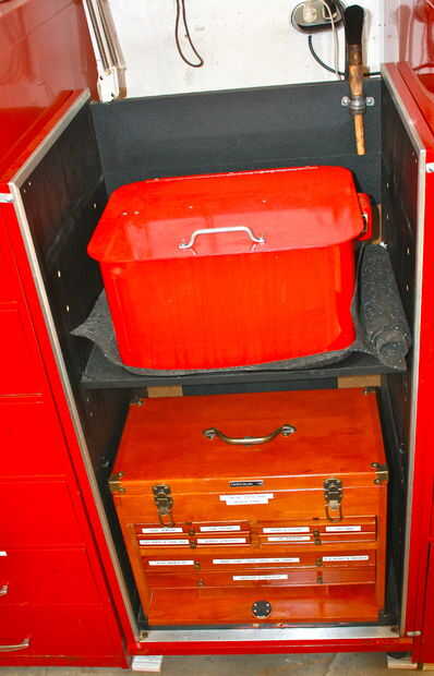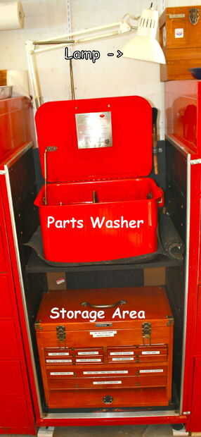 Este gabinete tenía puertas de cristal y una tapa de vidrio. Quité el vidrio. También había un estante fijo superior con tres estantes ajustables por debajo de ella. Quité el estante fijo porque era demasiado alta para la lavadora. Usé sólo en de los estantes ajustables para sostener la arandela de las piezas a una altura que es perfecta para mí. Por debajo de la lavadora es el lugar perfecto para guardar mi bicicleta herramientas, caja de herramientas.