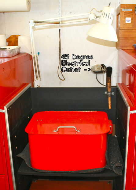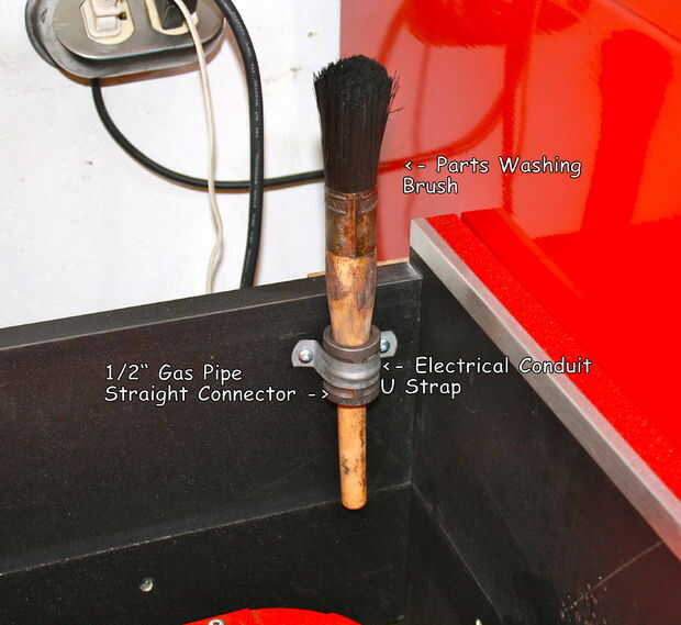 En el stand, taladré un agujero en la parte superior de la pared posterior para adaptarse a una luz plegable. En la otra esquina de la pared posterior, usé una instalación de tuberías de gas recto de 1/2" y había atado con una correa de conducto eléctrico U de 1". Esto es mis piezas cepillo de lavado. En la pared detrás de la lavadora, tenía un viejo piso 45 grados ángulo eléctrico enchufe de tipo caja. I esta había conectado a un viejo cable de extensión y había enchufado a una toma de corriente. Yo enchufe mi lavadora y luz en esto.