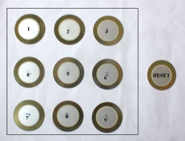 • Le da la señal de entrada a las puertas de la lógica cuando presionado por un usuario aquí una placa piezo-eléctricos dispuesta individualmente para cada número y montada para formar un teclado numérico. Se muestra a continuación es un montaje experimental.