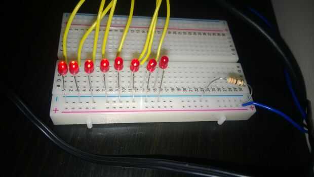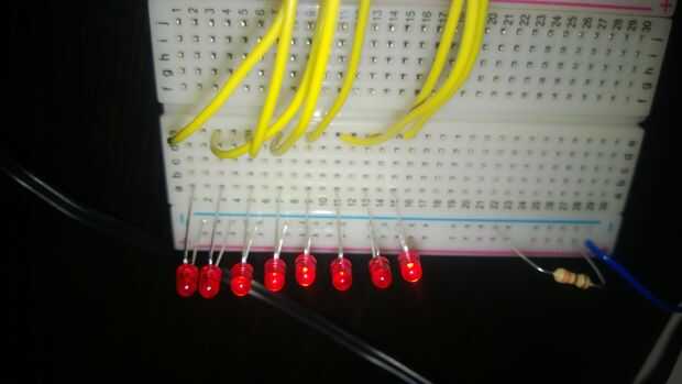 El cable azul en las fotos está conectado a la salida de 5V en el PiFace y el carril rojo largo corriendo por el lado de mi protoboard, conectar el carril rojo al azul usando el resistor, el carril azul tiene ahora una cantidad segura de voltaje para mi LED, así que puedo conectar los terminales positivo (el cable más largo) de los LEDs directamente a este carril. Los terminales negativos de los LEDs entonces necesitan estar conectado para separar las filas. Para cada fila con un LED necesita conectar un cable a una de las 8 salidas en el PiFace (he usado cables amarillo para esto), asegúrese de conectarlas en el orden.