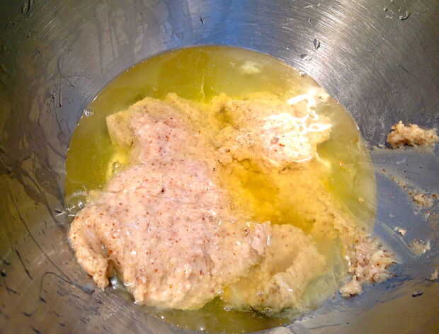 En una batidora, mezcle la pasta de almendras con las claras de huevo, la vainilla y el extracto de almendra. Añadir el azúcar y la harina, continuar mezclando hasta que quede bien mezclado.