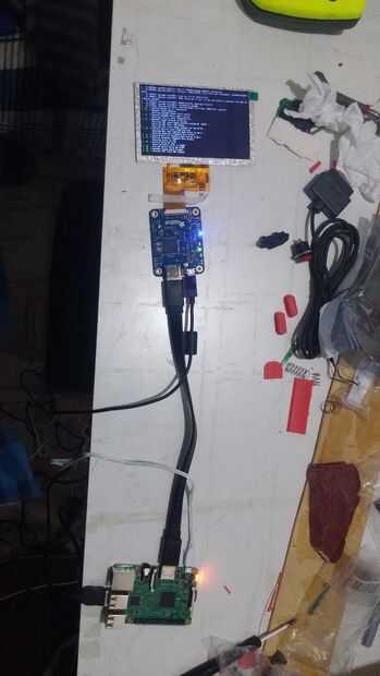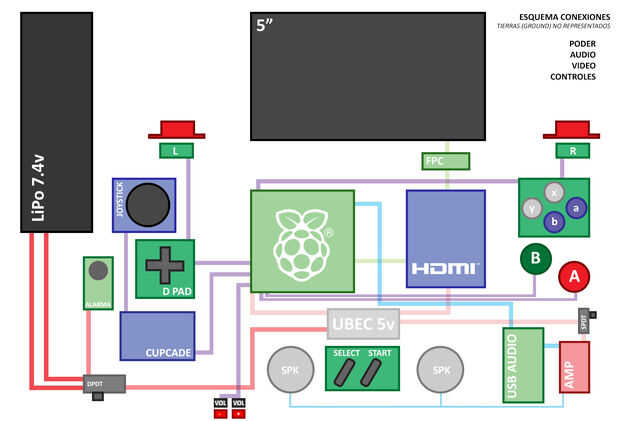 Para el vídeo se conecta el cable HDMI delgado entre el frambuesa y el Decodificador HDMI. Del decodificador venta un cable FPC se conecta a la extensión FPC y luego a la pantalla.