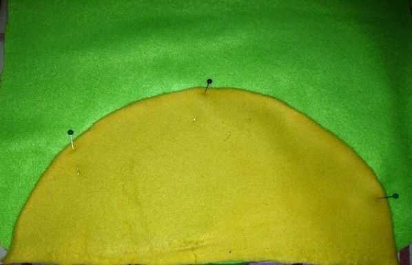 Vientre de PIN al lado derecho de la parte frontal inferior, alineando el borde recto del vientre con el borde inferior de la parte frontal inferior, coincidencia de centros. Coser por encima a lo largo de borde curvado del vientre.