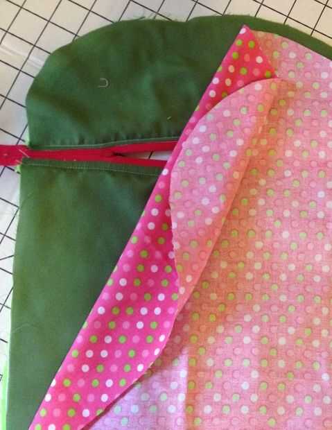 Ahora usted está conectando todas las capas del frente juntos: el polar verde exterior, bolsillo delantero y el bolsillo de atrás. Hilvanar, con margen de costura de 3/8".