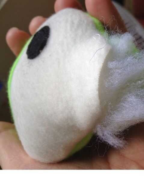 Gire a la derecha cosas con relleno de fibra poliester, dejando el relleno sobresale del agujero, para la estabilidad, para evitar que ojos tirarse alrededor de demasiado después de adjuntarlos a la mochila.