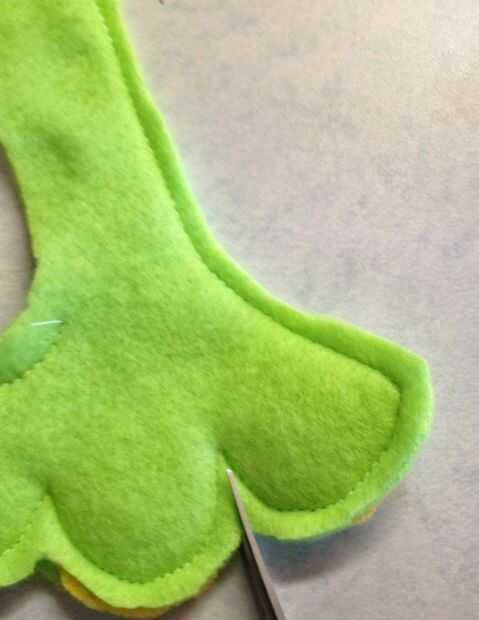 Con los lados del derecho juntos, utilizando el margen de costura de 3/8", coser pata verde sólido de sección a sección de la pierna con los cojines del dedo del pie amarillo, dejando a un lado de la pierna abierta. Muesca de clip entre los dedos del pie; Recortar curvas alrededor de los dedos del pie.
