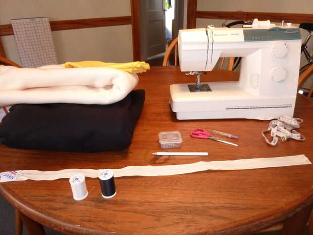 También se necesitan tijeras, alfileres, cinta de medir y probablemente una máquina de coser. Esto de coser a mano no sería difícil, sólo requiere mucho tiempo ya que hay un montón de costuras largo para coser.