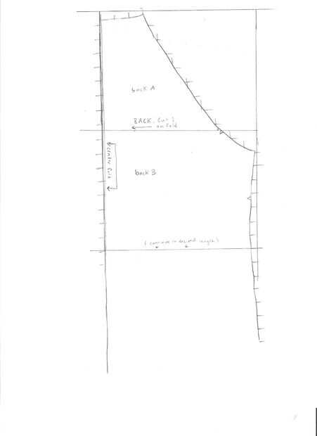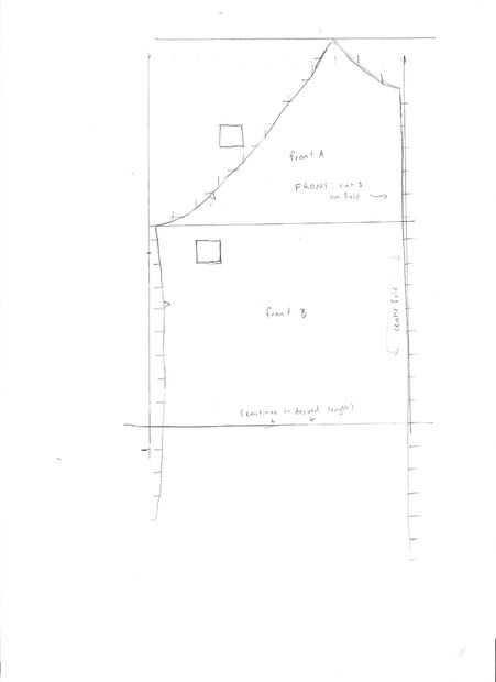 La parte delantera y trasera están para ser cortada en el doblez de centro, de continuo piezas de tela. No he incluido toda la longitud por lo que necesitará añadir por su cuenta, basado en las medidas que tomaste en el paso dos. También puede medir cómo ancho desea que la parte inferior para ser. Me mide 16"(que le da una 32" ancho parte inferior, que se traduce en aproximadamente 18" desde el agujero de un pie a otro, cuando lo haz hecho) desde la parte inferior del doblez de centro, en ángulo recto en el patrón y luego dibujó una línea recta de donde el lateral termina en el patrón dibujado hasta ese punto que haría la esquina exterior de la pieza. Hacer este mismo procedimiento para las piezas delanteras y traseros, con cualquier anchura sientes es mejor. Un fondo más amplio permite pasos más largos, sino demasiado y la parte media puede colgar hacia abajo y de la manera cuando usted está tratando de caminar. No te preocupes los agujeros de pie, vamos a añadir ésos más adelante.
