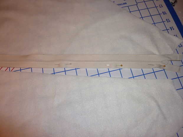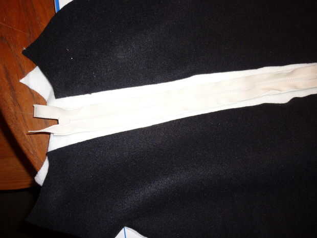(Si no utilizas dos capas para la parte delantera de los pijamas, usted puede todavía línea la cremallera simplemente uniendo tiras de tela en el interior de la cremallera. Hacer esto con cuidado, es importante que las tiras no obstaculizar los dientecitos pero todavía deben superponerse para que cubren completamente los dientes de la cremallera desde dentro.)
