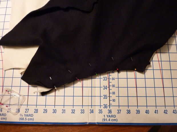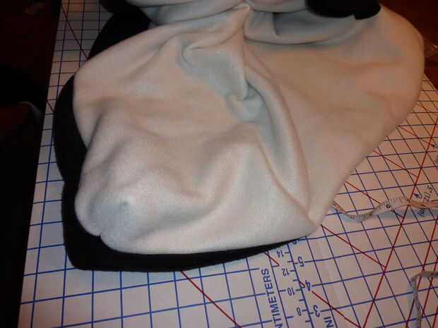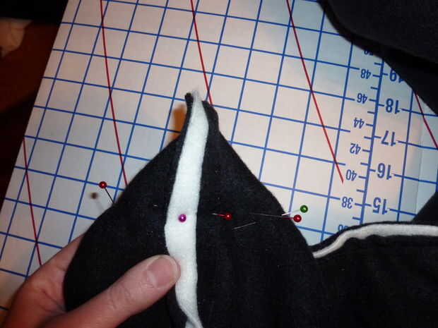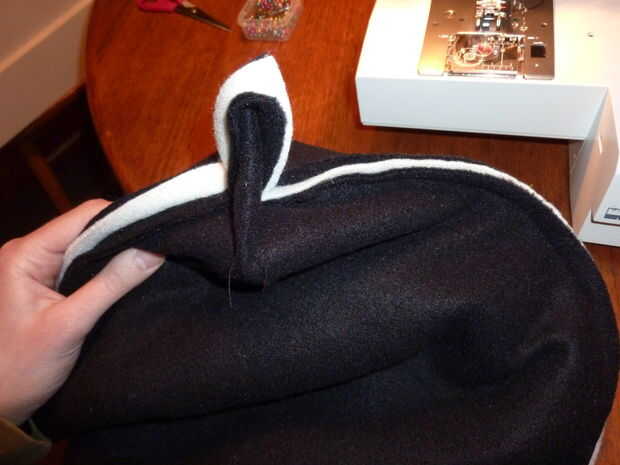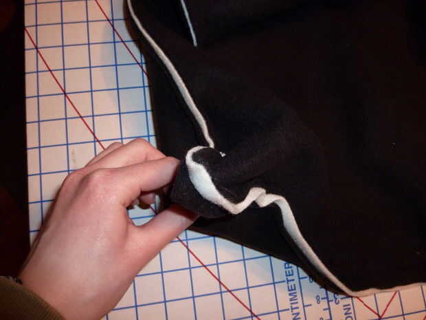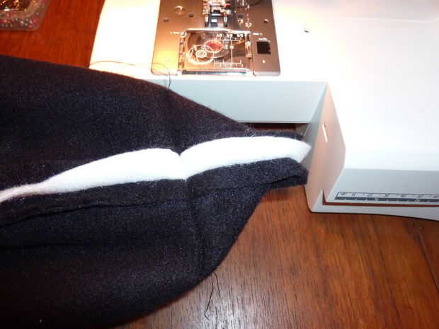 Importante: Al coser las costuras, tenga cuidado alrededor de los bolsillos (si has incluido alguno). Para los pijamas de pingüino blanco y negro, puede continuar derecho por coser la costura lateral todo mientras usted cuidado de no coger el exterior, ya terminado, borde del bolsillo. Asegúrate de coger el interior borde (que será de la guarnición de frente negra) de lo contrario tendrás un agujero en tus pijamas en vez de un bolsillo.