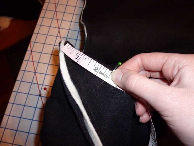 Las esquinas de la "bolsa" en este momento son un poco ásperas, para acabar con ellos, vuelva al reves las prendas de vestir y separe las capas de las esquinas como se muestra (cuidado si tienes una doble capa delantera para tirar todo a la derecha!). Vamos a cortar la esquina cosiendo a través de él. Mida aproximadamente 2.5" desde la esquina de la costura en cada lado y pin. Entonces perno recto para crear un triángulo isósceles. Coser todo recto. Puede cortar este rincón o dejarlo como está. Resultan la manera correcta de la ropa de descubrir su final.