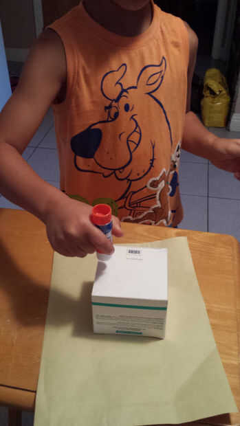 Cubra la caja entera y el papel con pegamento y luego Envuelva el papel alrededor de la caja.