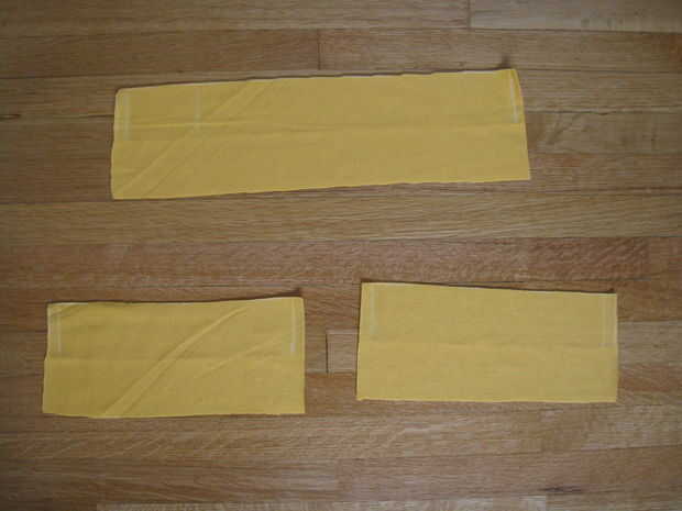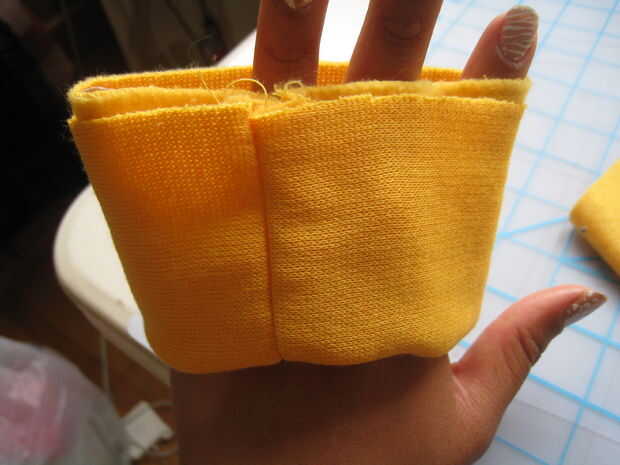 Para las mangas, primero Junte los lados derecha en cada una de las pulseras. Cosa hacia abajo para crear una forma de banda. Ahora tienes 2 pulseras en ciernes. Tomar las bandas y doblez de ellos estilo perrito caliente.