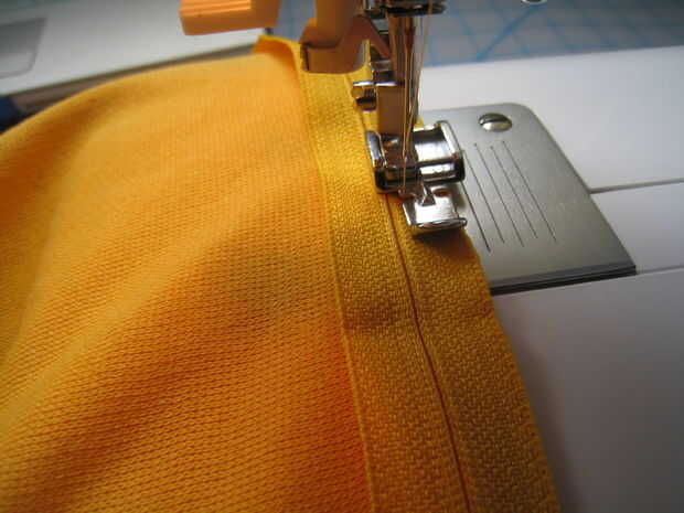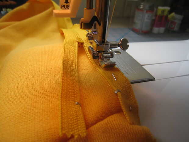 Primero prender la cremallera hacia abajo en un lado de la prenda y luego lo cose abajo. Puede tiene que, en un punto, mover la cremallera de coser.