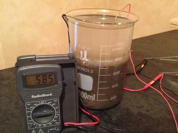 BOOM! Electricidad! Después de unos días puede ver la tensión aumentar a medida que más bacterias crezcan en el ánodo.