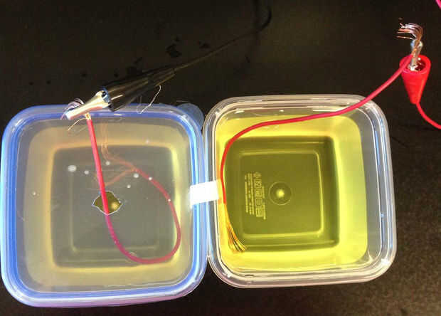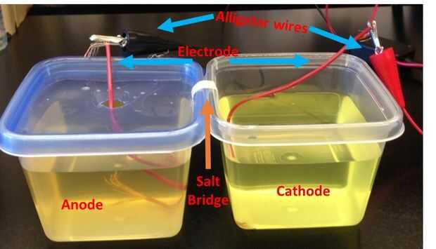 Introducir un electrodo en la cámara que contiene orina y amortiguamiento a través del agujero en el centro de la tapa y mosquetonee el extremo de los cables expuestos con las pinzas de cocodrilo negro. Clip de uno de los extremos del electrodo restante con las pinzas de cocodrilo roja y sumergir el otro extremo y en la cámara del cátodo. * hacer seguro de que los electrodos no estén en contacto con el puente de sal.