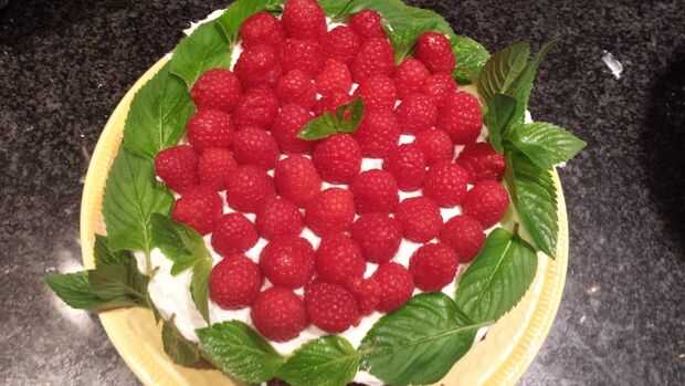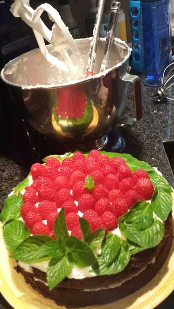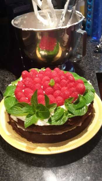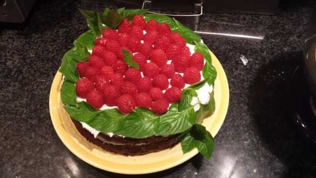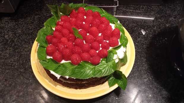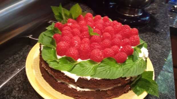 Añadir la menta y frambuesas al comienzo de la guinda de la torta de brownie.