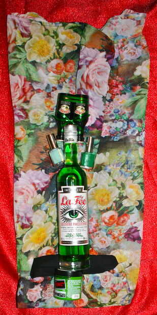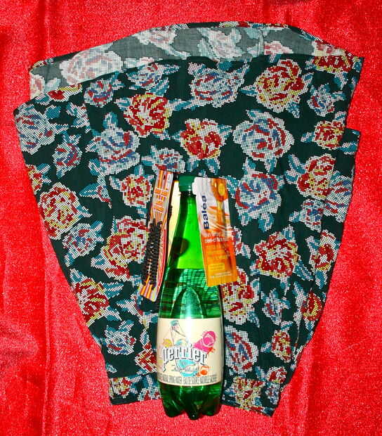 Extienda a la tela (camiseta, falda o bufanda) sobre una superficie plana y dobla hasta que es apenas lo suficientemente grande como para envolver sus productos escogidos con. Siguiente colocar la base hacia abajo y apilar ollas artículos directamente sobre ella o más pequeño knick knacks en la parte superior de la capa (opcional: atar pequeños regalos en su botella con un trozo de cinta.)