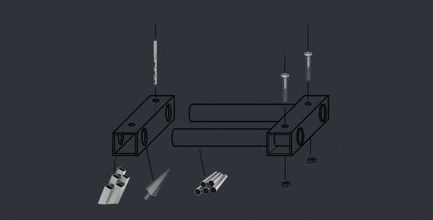 Ahora corte 2 piezas de tubo cuadrado, mina fueron 12 cm pero depende de usted, marque la línea central y hacer agujeros en la misma distancia exacta de cada pieza... entonces usted puede deslizar los tubos a través de ellos y para hacerlo más sólido, taladro los agujeros verticales para cada tubo y añadir polts y tuercas para fijar todo