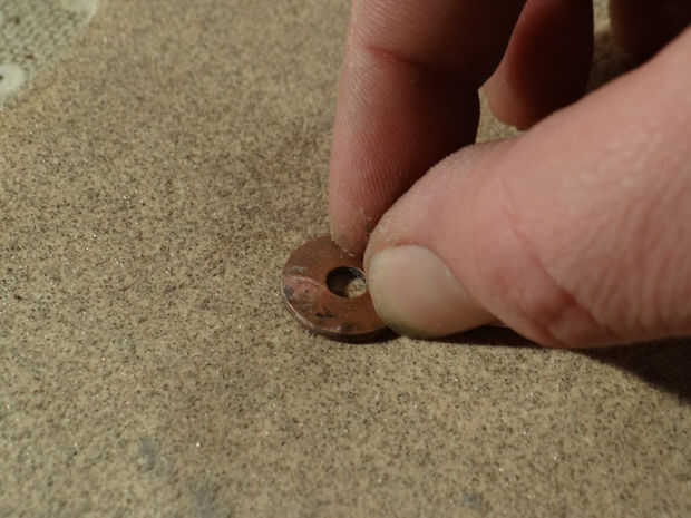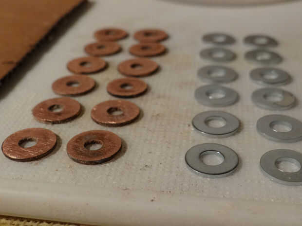 El cobre y el Zinc arandelas planas van a servir como ánodos y cátodos para su batería separados por un electrolito. Se construirá esta batería de 11 celdas en serie para crear un sólido 1,5 voltios.