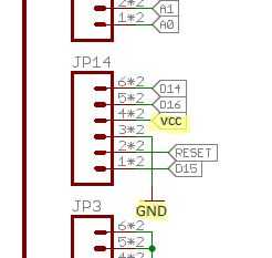 En el lado izquierdo del esquema PDF son los encabezados de conector en la parte inferior de la Junta Makey Makey (mostrada aquí en la segunda ampliación). JP14 representa el Makey Makey mentira conector lado hacia arriba, el conector en la parte superior central. Conectamos nuestros alambres de soporte de batería para los 5V y GND pernos de este conector.