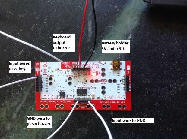 Entrada: Inserte un alambre de puente blanco en el conector de tierra/tierra y un segundo puente de alambre en el pasador W del conector izquierdo. Estos servirán como sus controles. Cuando se les tocan juntos, que completan el circuito y causar el timbre al sonido.