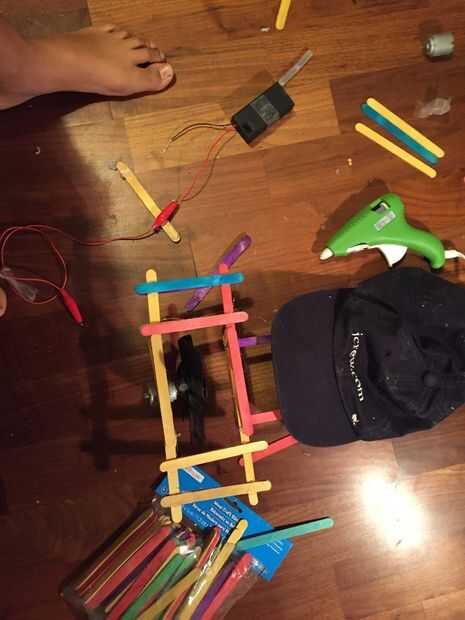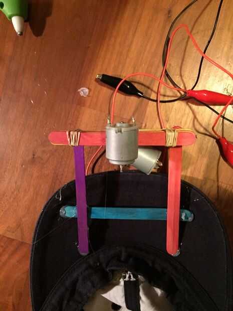 Pegar un lado del motor y fíjelo a la parte inferior del palito más caliente. Cada cable en los palitos y adjuntarlos a un paquete de baterías. Esto puede montar en la parte superior del sombrero, o simplemente puede mantenerla.