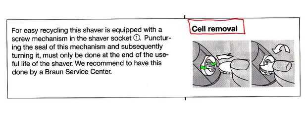 El primer problema es cómo abrir el caso de la afeitadora. Este gráfico del manual de la máquina de afeitar proporciona una descripción. Sin embargo, estas instrucciones asumen que ya no usará la afeitadora después de abrir para quitar las pilas para el reciclaje. El sello es verde como se muestra. Utilice una moneda grande para empujar y romper el sello. Luego, gire el accesorio redondo donde el cable fija a unos 45 grados hacia la izquierda. Este conector de cable apropiado de rotación requiere considerable fuerza. Tuve que agarrar un dólar cuarto de Estados Unidos con un par de pinzas para aplicar suficiente fuerza.