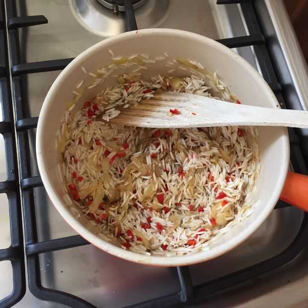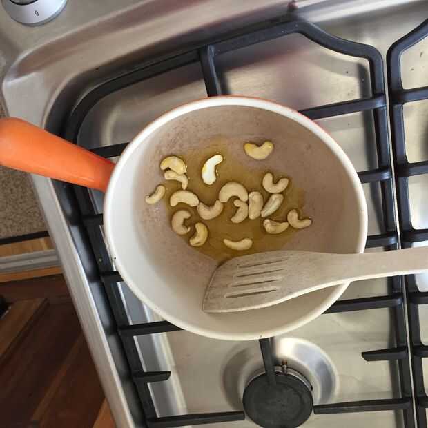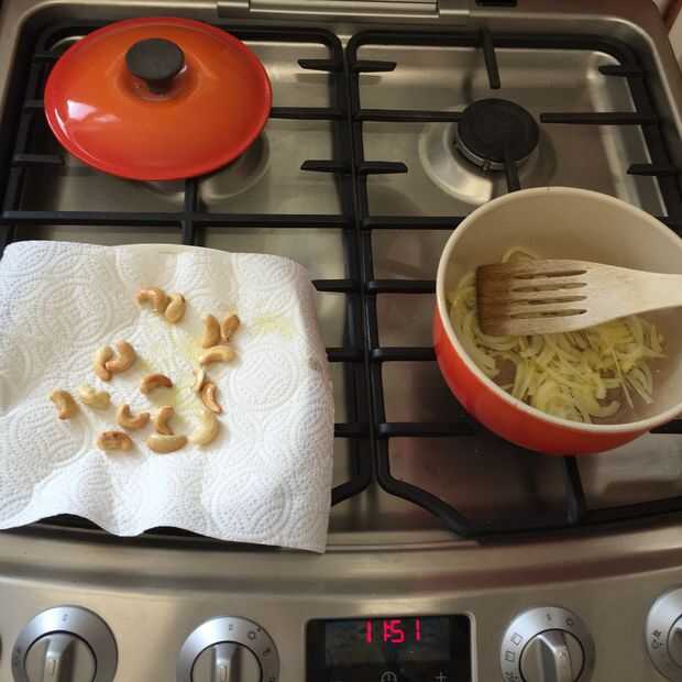 Calentar el aceite en una sartén pesada a fuego medio. Freír los anacardos hasta que se dore, luego sacar en papel de cocina. Freír la cebolla en el mismo aceite durante unos 5 minutos, bajar el calor cuando empiece a dorarse. Agregue el ajo, jengibre, guindilla, garam masala, arroz sal y escurrida. Freír por un par de minutos, revolviendo para cubrir el arroz con el aceite.
