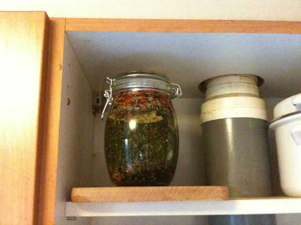 Dos veces al día gire lentamente el frasco, así los ingredientes y sabores se mezclan mejor. Seguir haciendo esto durante dos semanas y el aceite debe ser perfecto. Por supuesto puede mantener degustarlo e infundir más cortos o más largos hasta que parece a ti.