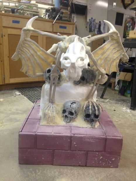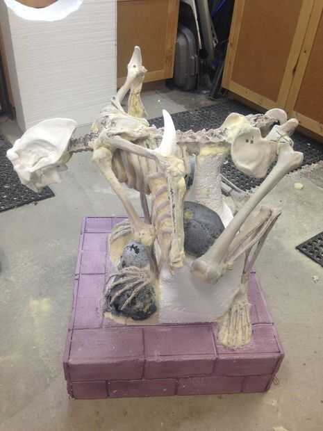 Ahora pasemos a las gárgolas se comienza con la cabeza. La cabeza fue esculpida por eliminar grandes porciones de y luego agregando nuevas funciones a un modelo de un cráneo humano. El cráneo fue alargado y la frente presentado. Los zócalos del ojo se amplió significativamente y abiertos a los lados. Desde este punto se hizo un molde y se hizo una réplica de plástico de espuma sin cáscara.