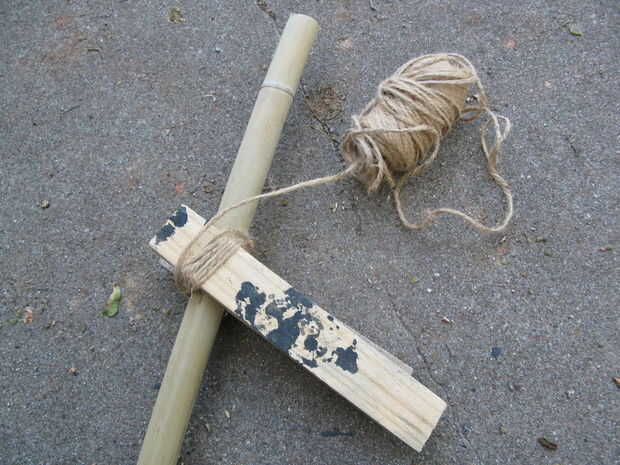 Después de atar de la cuerda (no en las fotos, para no perder todo), agarra los dos tableros del reposapiés y gire los extremos largos de bambú de unos 70 grados. (Si vas para un completo 90 grados, el peso de la persona será probablemente empujar demasiado abajo.) La guita te debe resistir. Si puede moderadamente fácilmente empujas los tableros reposapiés a 90 grados, es porque no usó la suficiente guita o no apriete la cuerda en el paso anterior. Desea que los reposapiés no se vaya por debajo de horizontal, después de todo. Así que si no está apretado lo suficiente, empezar con la guita, o sólo tiene que añadir más.