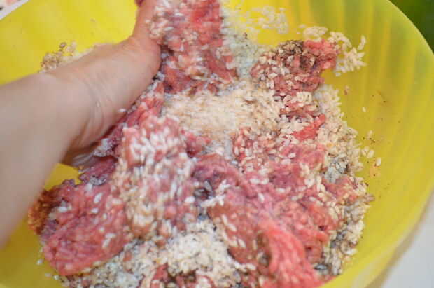 Coloque el arroz en un tazón grande y agregar que el aceite de oliva y todas las especias con la carne molida, comenzaron a poner todo junto muy bien.