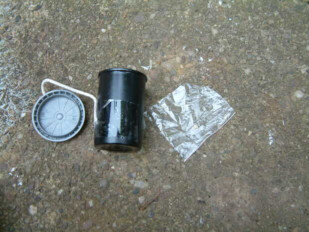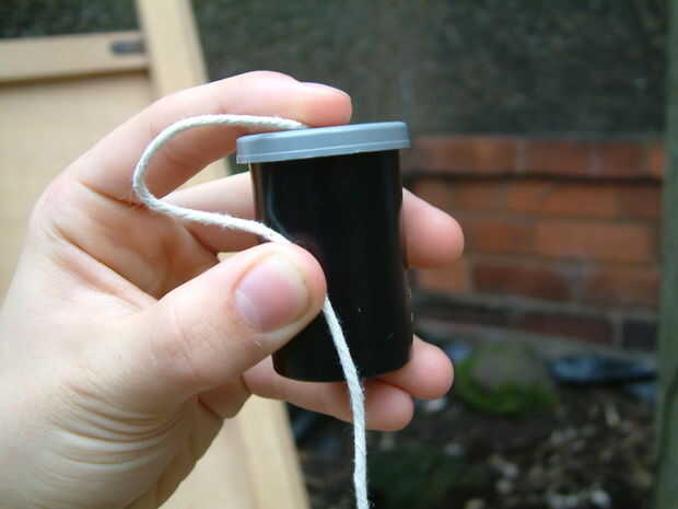 3. corte de algunas cuerdas (o cualquier otro material como él) es cerca de 10 centímetros o 4 pulgadas de largo entonces tomar el celotape y pegar un extremo de la cuerda a la lata y un extremo a la tapa dejando un poco de holgura en el centro de modo que puede soplar la parte superior.