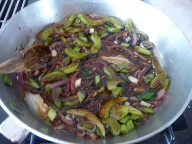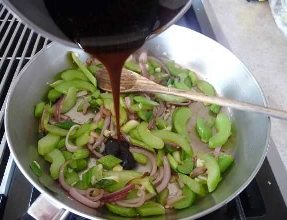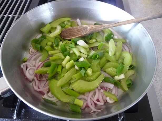 Añadir el apio en rodajas, cebolla y ajo picado a la sartén. Remover constantemente durante 1-2 minutos hasta que el apio esté crujientes.
