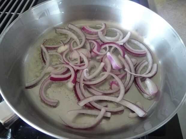 Añadir la cebolla roja/amarilla en rodajas a la sartén, revolviendo constantemente durante aproximadamente un minuto. En este punto, la sartén se ha enfriado significativamente. Girar el calor hasta el alta si es necesario.