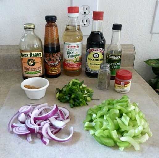 Revuelva todos los ingredientes de la salsa juntos en un tazón pequeño, permitiendo que unos 10-15 minutos para los sabores se mezclan/madurar mientras que corta las verduras. Antes de freír, probar la salsa y ajustar el calor y dulzura deseada.