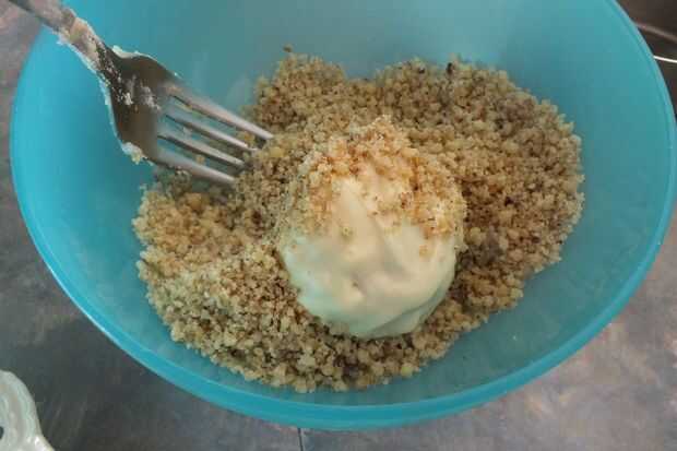 Enrolle cuidadosamente en las migas de frutos secos. Lugar en un papel de pergamino y a la cera forrado para hornear que se seque.