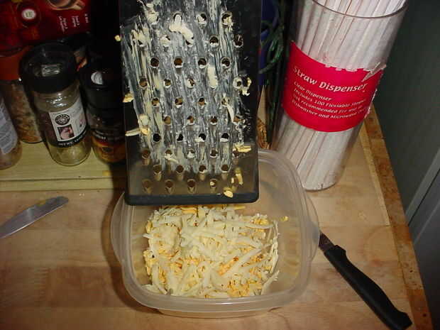 Rallar el queso o los quesos en el recipiente vas a mezclar y almacenar el queso, esto le ahorra en detergente