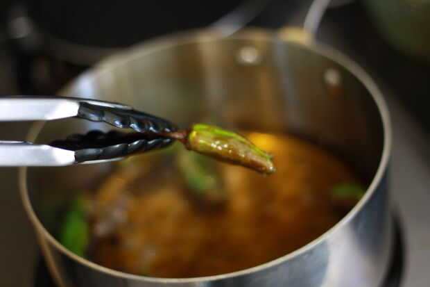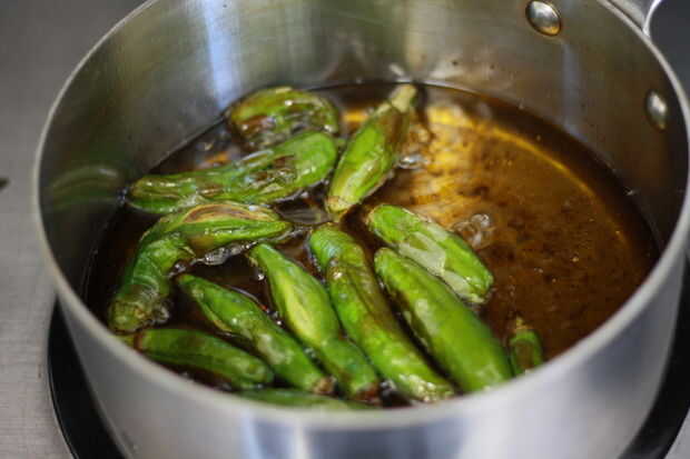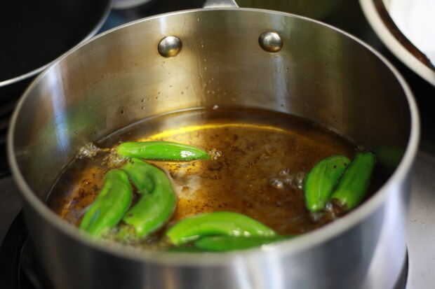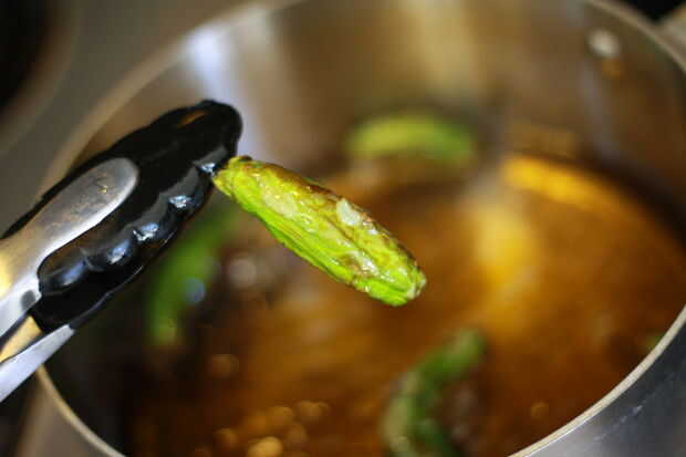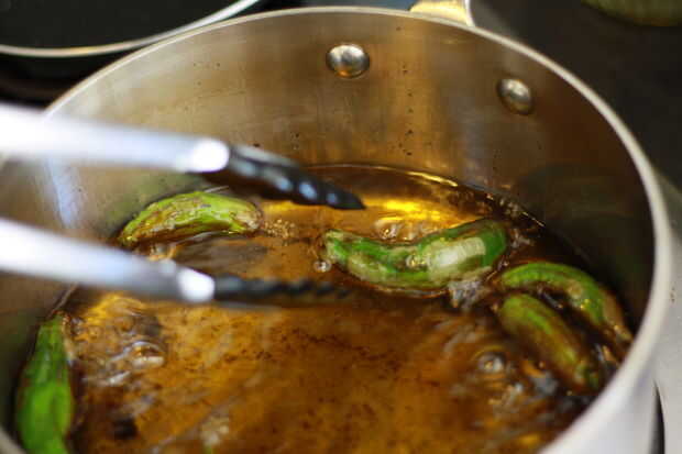 Una vez que dejaron de escupir, he quitado la pantalla de salpicaduras y revolvió los pimientos para asegurarse de que ambos lados se que cocinaron.  Una vez comenzaron a buscar un poco arrugada y ampollas, llevaron hacia fuera.  Si es posible, tome los tallos para evitar desinflar a cualquiera de los pimientos.